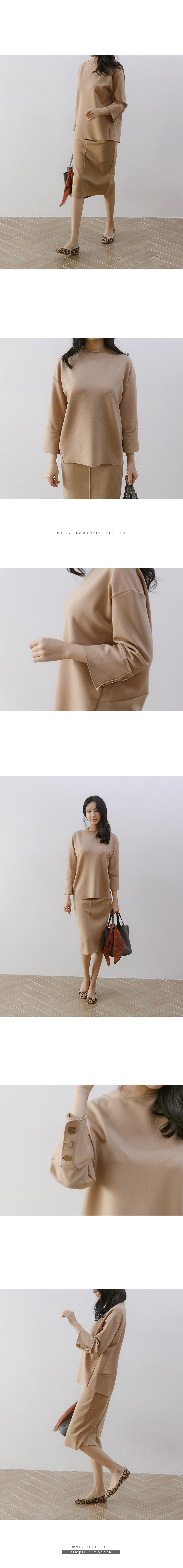 단정한 보트넥에 8부 소매는 뒤쪽으로 3개의 버튼이 포인트가 되어주고 사선으로 떨어지는 옆선과 힙선을 살려주는 독특한 패턴의 디테일에 깔끔한 커팅라인이 멋스러워요!