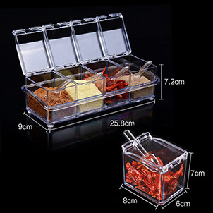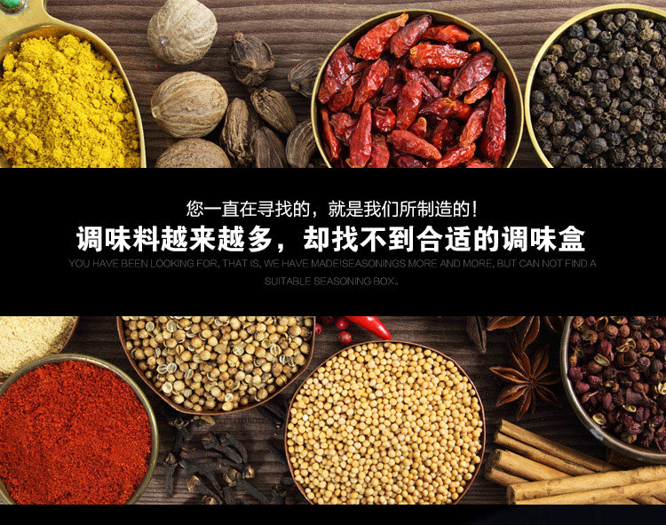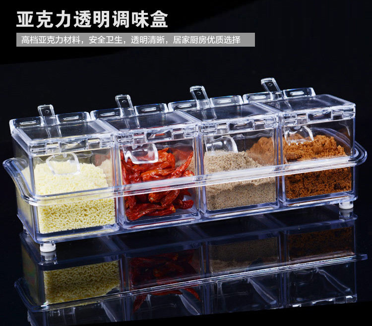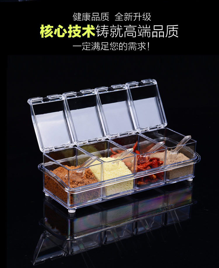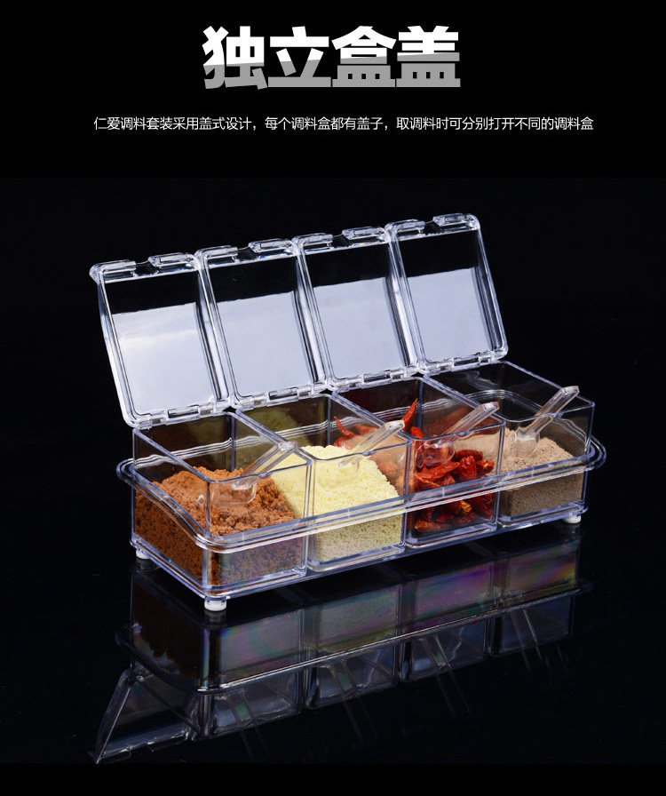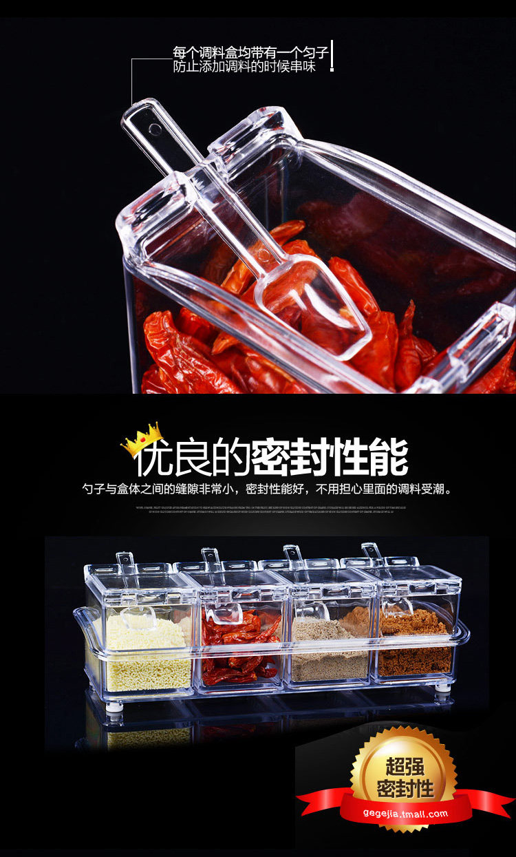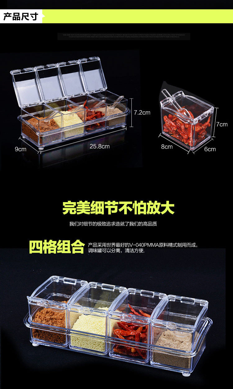介绍:四格组合调味罐,盒身全体透明,调料放在里面一目了然,