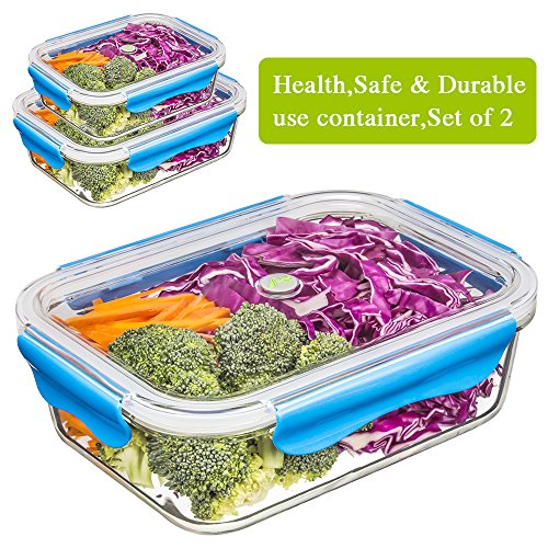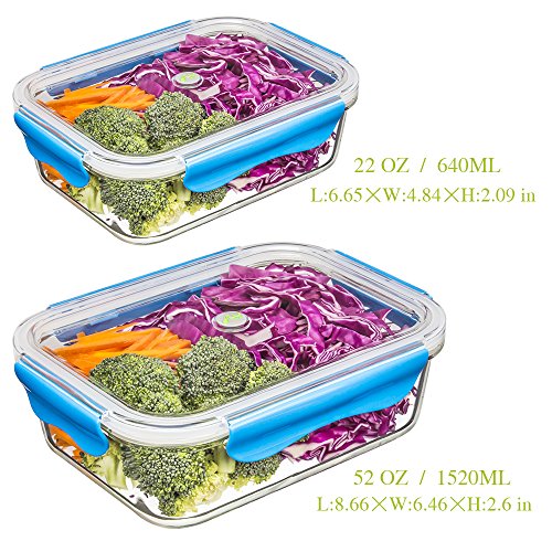 [2-Pack] Food Storage Container, Glass Meal Prep Container Airtight Food Container Set, Bento Lunch Box, BPA-Free, Stackable, Leak-proof, Microwave, Oven, Freezer, Dishwasher Safe [22oz & 52oz]