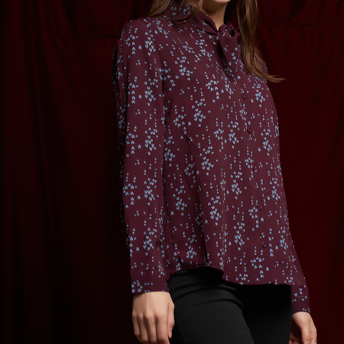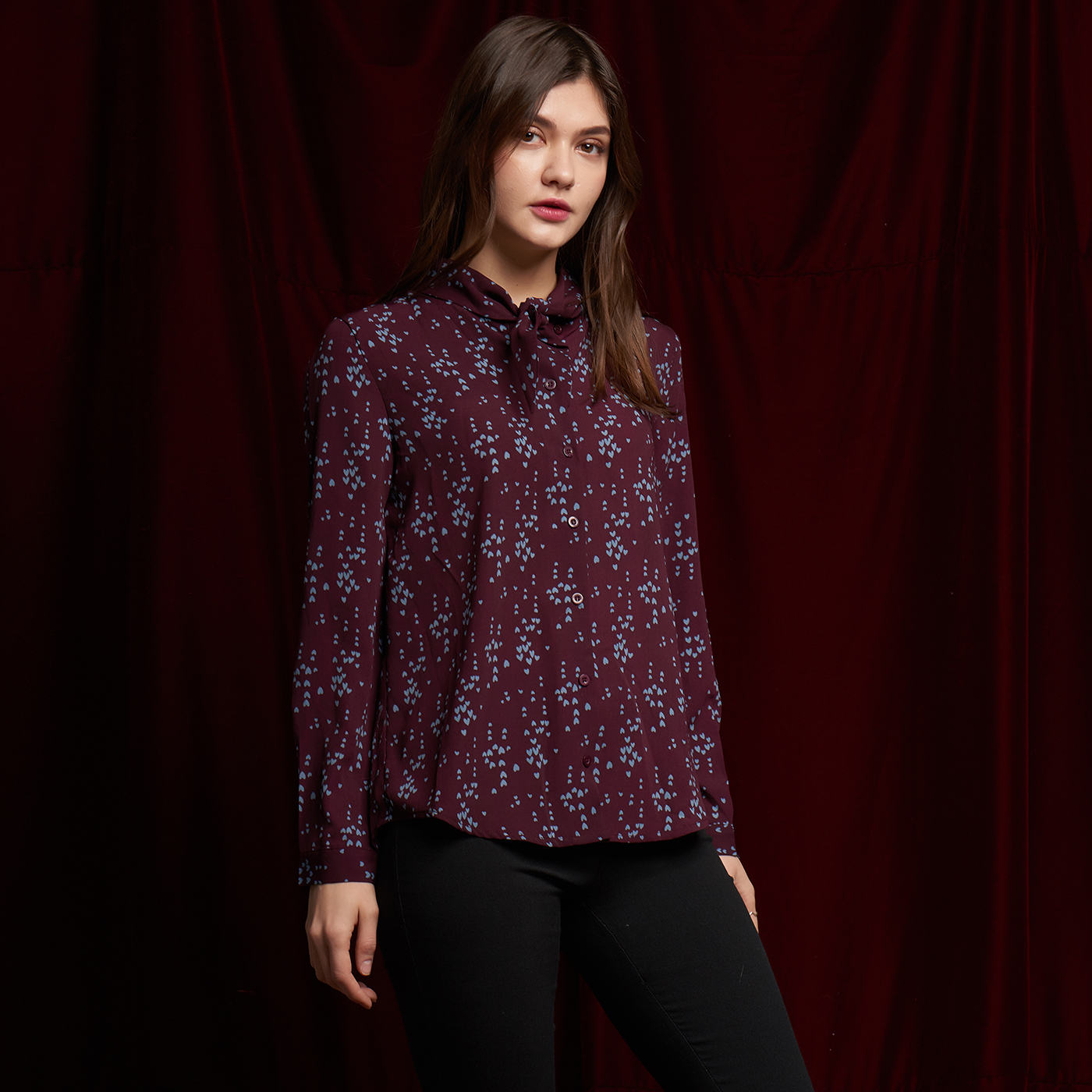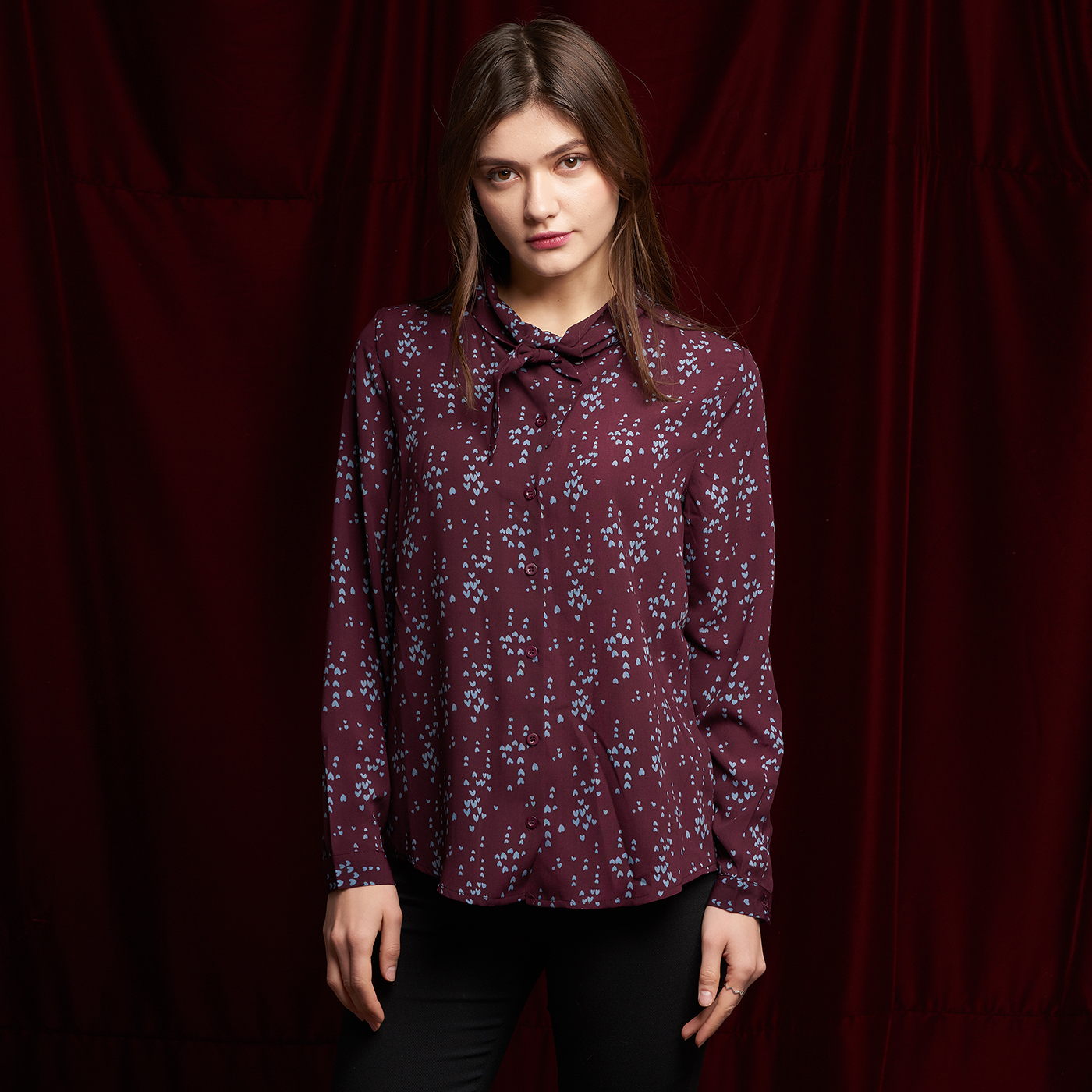 귀여운 하트 패턴과 넥 디자인의 디테일이 개성있는 스타일입니다.
