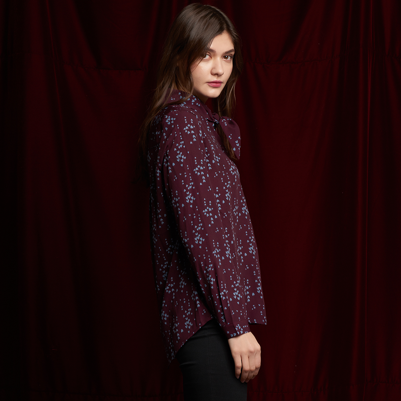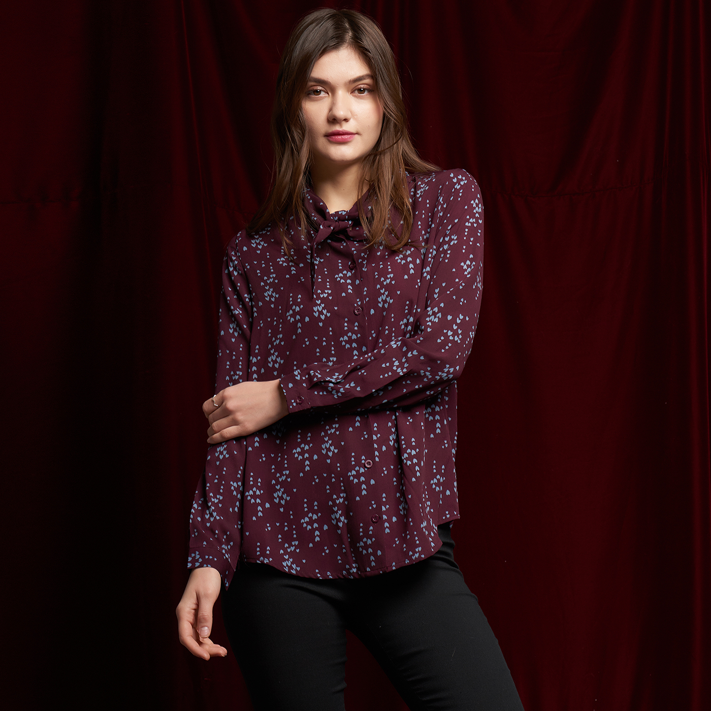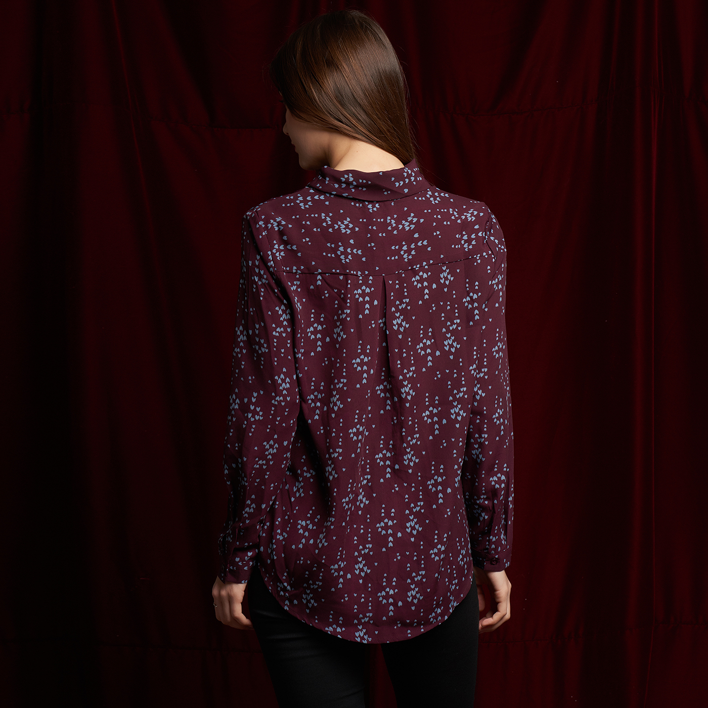 귀여운 하트 패턴과 넥 디자인의 디테일이 개성있는 스타일입니다.