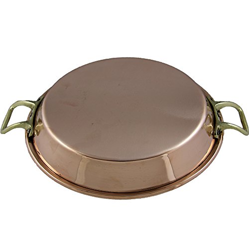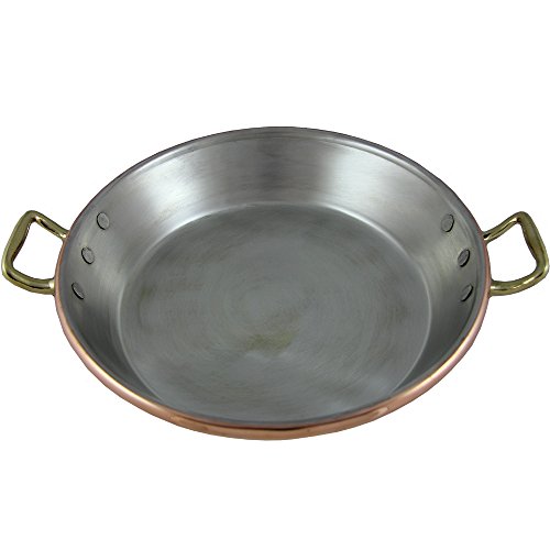 Product Description This is the traditional paella pan that has been used in Spain for centuries. This copper paella pan is a work of art - on your table, or displayed on your kitchen wall. Hammered in Portugal, this pan adds a touch of rustic beauty when serving paella. But even more than that, copper paella pans produce the finest paellas. Copper is a superior conductor, and copper paella pans conduct heat so well that you can simmer your paella at a lower temperature, thereby preserving some of the subtle flavors of your broth and the ingredients. With a copper paella pan, you do not need the higher heat required of stainless or rolled steel paella pans. The heavy gauge copper (14 gauge, 2 mm) is lined with tin to provide the ideal combination of heat conduction and a hygienic practical cooking surface. Your copper pan is oven safe, and can be used on gas, electric and ceramic burners. Your copper paella pan requires no seasoning, simply wash with warm soapy water before first use. Use only wood or plastic cooking utensils to avoid scratching the paella pan. To preserve the luster of the copper, wash by hand after each use and dry thoroughly. Copper tends to tarnish, so you will need to use copper polish to restore the original shine from time to time. 0