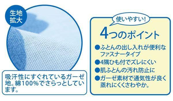 | 4隅ひも付きでズレにくく、ふとんの出し入れが便利なファスナータイプ。ガーゼ素材で通気性が良く吸汗性にすぐれており、蒸れにくくさわやか。綿100%なのでさらっとしています。肌ふとんの汚れ防止にぴったり!! |