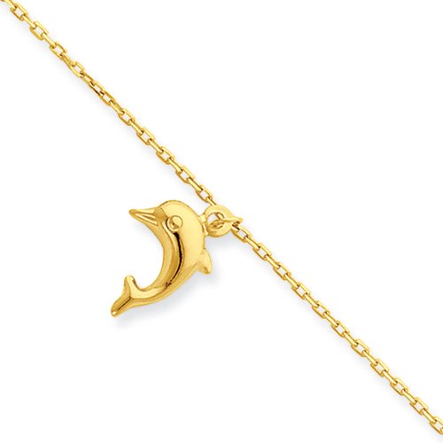 Incredibly fun to wear, a polished 3-dimensional 9mm dolphin anklet created from 14k yellow gold will swim above your foot in a carefree fashion. The 1mm width cable chain secures to your ankle with a spring ring clasp and is adjustable in length from 9 to 10 inches.Feature