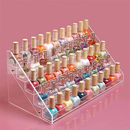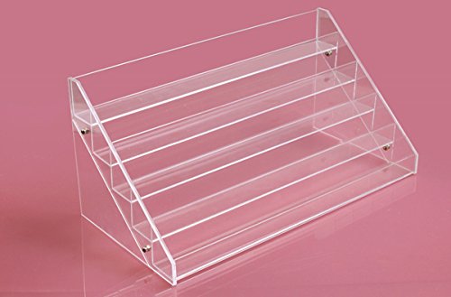 Acrylic nail polish rack 5 tiers arranged in a stair-step fashion. Each tier comes with a low railing to help keep the items in place.