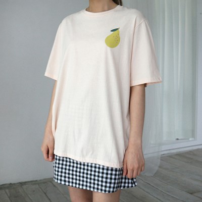 - 귀여운 과일 프린팅이 바스트 라인에 날염된 티셔츠입니다.