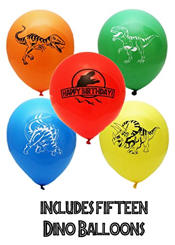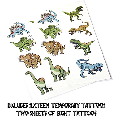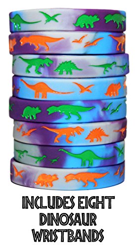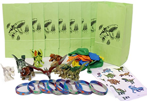 -. Feature : DINO BLOCKS! - Includes 8 Dinosaur Block Toys Compatible with Most Building Blocks / AWESOME WRISTBANDS - 8 Dino Wristbands Featuring a Panorama of Green and Orange Dinos! Bands Measure 1/2" wide x 7-1/2" long. / 16 TEMPORARY TATTOOS - Includes 2 Sheets of 8 Temporary Dinosaur Tattoos - 16 Total Tats (8 Unique Designs!) / JURASSIC STYLE BALLOONS - 15 Dino Balloons in Assorted Colors - Jurassic Happy Birthday, T-Rex, Triceratops, Velociraptor & Stegosaurus! / RAPTOR GOODIE BAGS - 8 Velociraptor Goody Bags Included to Carry Home All the Loot!