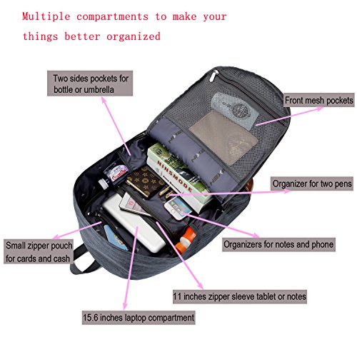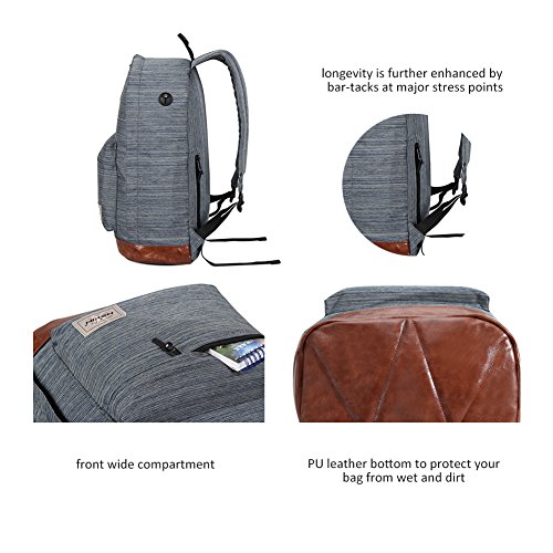 -. Feature : Material:85%Canvas+15%PU.Made of high-density,durable,water-resistant Oxford fabric,features strongest metal SBS zippers with no worry about getting stuck. / Capacity(35L),Roommy(18.5*6.7*14.5inches).Large capacity to hold daily essencials.Outter has one zipper mid-sized pouch for quick access to small items.One back zipper pocket,a port for headphone wires on the top of right. / Make things better organized.Interior features:A mesh zipper compartment in the front, dual slip side pockets for water bottles, 15.6 inches laptop compartment, 11 inches zipper sleeve tablet or notes, organizers for charger and mouse, organizer for two pens, small zipper pouch for cards and cash. / Unique design,stylish look with practicality.Anti-slip faux leather bottom stabilizes bag on the ground and protects the bag from dirt and wet.Moreover,it adds to the sense of fashion.Adjustable padded shoulder straps and padded back pannel make it comfortable to carry. / Versatile-minimal, uP.R.Ight and classic design fits your everyday. Perfect size to service at school, work, travel, and anywhere else.You will love it.