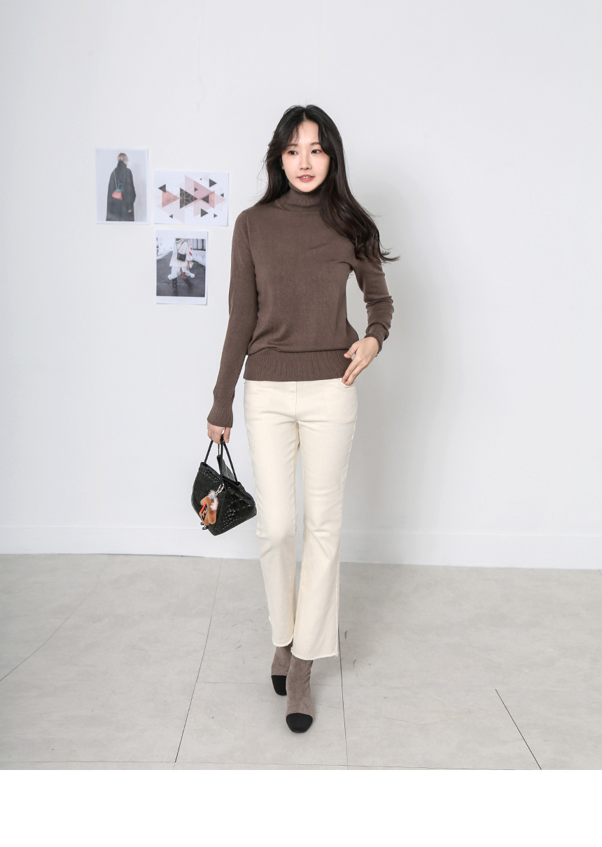 무릎선 아래로 살짝 퍼지는 부츠컷으로