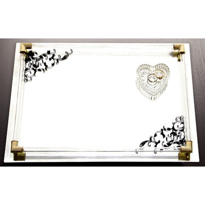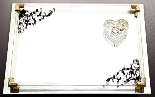 Product Description Enjoy this mirror vanity tray. It is made of glass with a black scroll design and gold corner accents. It is 14 by 10-inch. This item is a great gift. 0