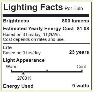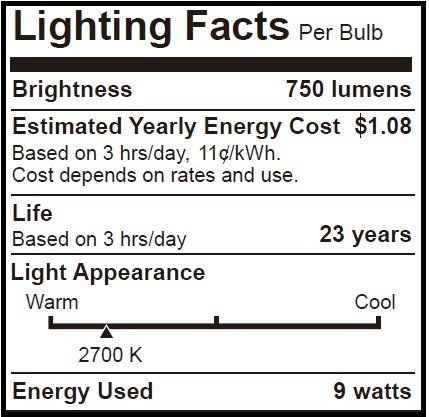 60 watt equivalent using only 9 watts; 750 Lumens of soft white light
