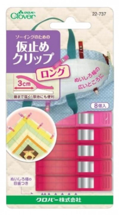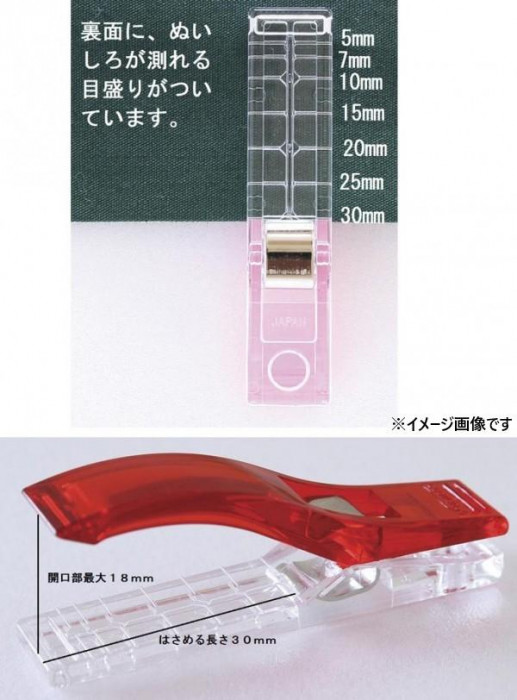 通常タイプ(1cm)の「フラットな台座」「大きな開口幅」「目盛つき」の特徴はそのままに、はさめる長さを1cmから3cmに伸ばしました。仮止めクリップは針で穴が開いてしまうラミネート生地、合皮、革などのソーイングに便利です。「待針でとめにくい生地の仮止め」、「厚地」、「ファスナー」、「ふちどりテープの仮止め」、「生地が重なって厚くなる部分」、「ロックミシンのソーイング」と様々なシーンで活躍します。 |