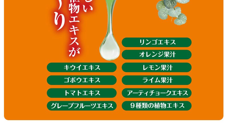 | 成分 | 【有効成分】グリチルリチン酸ジカリウム、プラセンタエキス(1) 【その他の成分】精製水、3-メチル-1,3-ブタンジオール、濃グリセリン、1,2-ペンタンジオール、カルボキシビニルポリマー、水酸化カリウム、ハチミツ、ヒアルロン酸ナトリウム(2)、サクシニルアテロコラーゲン液、ダイズエキス、オウゴンエキス、カワラヨモギエキス、アロエエキス(2)、加水分解シルク液、ローヤルゼリーエキス、加水分解コンキオリン液、ユキノシタエキス、アーティチョークエキス、ニーム葉エキス、キウイエキス、ゴボウエキス、トマトエキス、2-メタクリロイルオキシエチルホスホリルコリン・メタクリル酸ブチル共重合体液、ヨクイニンエキス、サンザシエキス、タイソウエキス、グレープフルーツエキス、リンゴエキス、オレンジ果汁、レモン果汁、ライム果汁、海水乾燥物(2)、ポリオキシエチレン硬化ヒマシ油、1,3ーブチレングリコール、無水エタノール、エタノール、フェノキシエタノール |