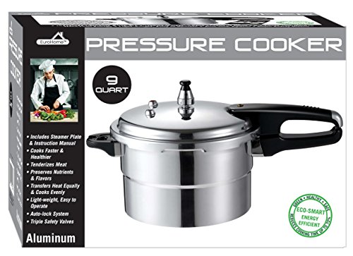 Pressure cookers are a superb way to cook delicious, nutritious and healthy food and If you are looking for a great, easy, and a fast way to make delicious and healthy meals, a pressure cooker is a must have for your kitchen. The EuroWare Model 319 Deluxe Pressure Cooker is made of premium aluminum and boasts many different features. It will reduce your cooking time by up to 70% and you can less time in the kitchen and more time in at the table. Pressure is creating by sealing the water, broth or whatever other liquid you may cooking and trapping the steam in order to raise the internal pressure which will then raise the temprature. The EuroWare 319 measures 9.75"L x 17.25"H x 12" W and can hold up to 9 quarts at once. It also features a crucial autolock system, a steamer plate and 3 safety valves. So preserve the flavor and preserve the nutrients got fish, meat, chicken, soup, broth and more with the EuroWare Deluxe Pressure Cooker.Feature