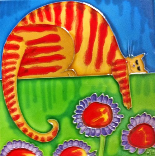 Continental Art Center BD-0345 8 by 8-Inch Orange Striped Cartoon Cat with Turquoise Background Ceramic Art Tile