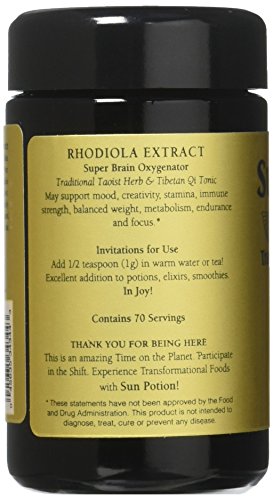 -. Feature : SUN POTION RHODIOLA ROOT POWDER is 100% pure, clean, and vegan, gluten-free with no additives or preservatives, non-gmo, and no artificial flavors or colors. / HELPS BOOST ENERGY MOOD AND PERFORMANCE Rhodiola Rosea helps boost energy levels, may increase athletic endurance, and promotes sexual health. / HELPS IMPROVE ABILITY TO ABSORB OXYGEN Mildly stimulating in nature and may facilitate mental clarity, promote creativity and stamina, helps immune strength, and may support weight balance, longevity, and focus. / OUR SOURCE Sun Potion Rhodiola is a 10:1 Cold Water Extract of Rhodiola Rosea, Wildcrafted in Tibet. / 100% SATISFACTION GUARANTEE Sun Potion products are made in the USA by strict GMP guidelines in an FDA approved facility. We are 100% confident and stand behind the quality. We believe the added health benefits of the product will make you feel as great as it does us or your money back!