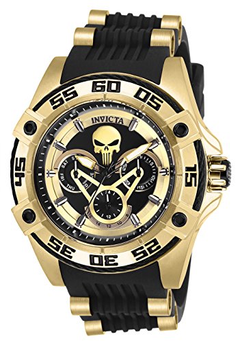Item model number: 27034 Batteries: 1 Lithium ion batteries required. (included) Date first listed on Amazon: May 25, 2018 Brand, Seller, or Collection Name:Invicta Model number:27034 Part Number:27034 Model Year:2018 Item Shape:Round Dial window material type:Flame Fusion Display Type:Analog Clasp:Buckle Case material:Stainless Steel Case diameter:43 millimeters Case Thickness:17 millimeters Band Material:Polyurethane/Stainless Steel Band length:Women's long Band width:22 millimeters Band Color:Black/Gold Dial color:Black Bezel material:Stainless Steel Bezel function:Unidirectional Calendar:Day Special features:Chronograph Item weight:12.32 Ounces Movement:Japanese quartz Water resistant depth:100 Meters
