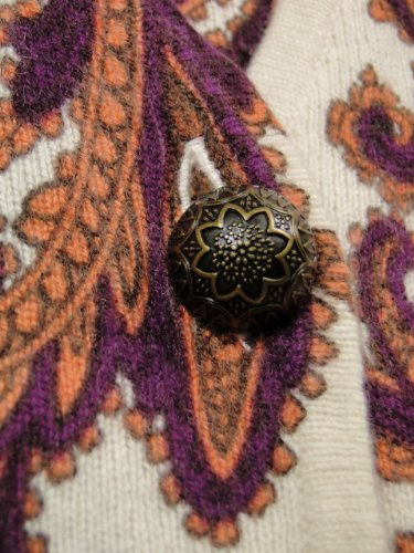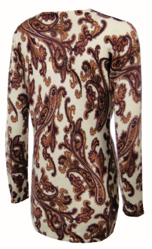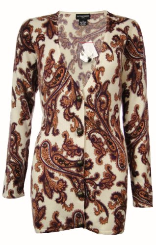 Studio : Sutton Studio Publisher : Sutton Studio Binding : Apparel Product Description You can't go wrong with Sutton Studio's Cashmere Paisley Cardigan. Features include soft 2 ply cashmere, V-neck, long sleeves, long tunic design length, 5 button front, decorative buttons, and multi-color paisley pattern in orange, purple, and ivory. 100% Cashmere. Dry clean. Made in China. 0