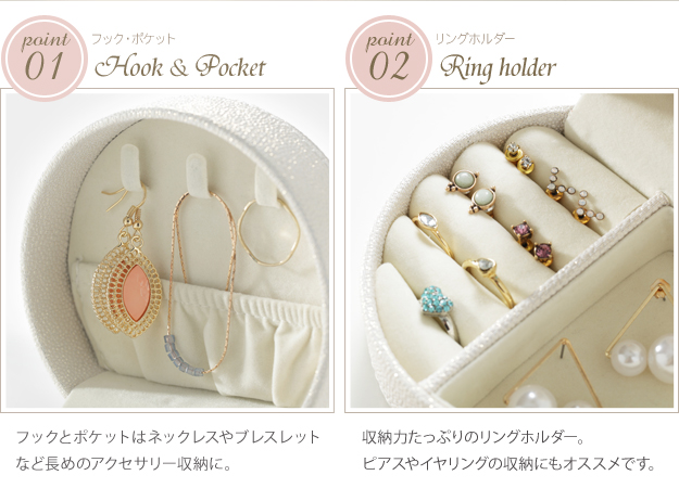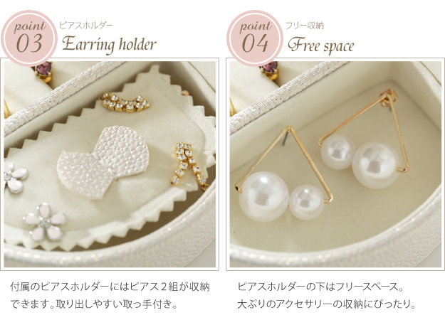 ●商品について:バッグにもすっぽり入るコンパクトなジュエリーボックスです。お手持ちのアクセサリーが少ない方はもちろん、仕事中や旅行先などちょっと外しておきたいときにも安心して収納できます。光沢のあるソフトな色合いのケースは上品さもあり、贈り物としてもお勧めです。
