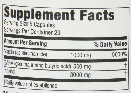 -. Feature : Pack of two, 100 capsules per pack (total of 200 capsules) / It is a scientifically formulated and synergistic combination of the amino acid derivative gamma amino butyric acid / Includes inositol and the vitamin niacinamide / No Soy, Yeast, Wheat, Milk or Egg Derivatives Added / No sugars, flavors, colors or preservatives