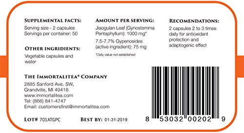 -. Feature : SUPERCHARGE YOUR METABOLISM with nature's most POWERFUL AMPK ACTIVATOR - Gynostemma pentaphyllum, called Jiao Gu Lan in Chinese, is scientifically proven the best AMPK Activator supplement, even more powerful than berberine or quercetin pills. AMPK activation is key to HEALTHY WEIGHT LOSS. Gynostemma is also a POTENT ANTIOXIDANT SUPPLMENT. Herbalists consider it the KING OF NATURAL ADAPTOGENS. You'll have more stamina and gravitate toward healthy cholesterol and blood sugar levels / BOOST YOUR IMMUNE SYSTEM - Gynostemma is often called SOUTHERN GINSENG, because it provides many of the same health benefits of ginseng. But, scientists were shocked to discover it actually has 127 different saponins & gypenosides, that's 7X the power of regular ginseng. Our jiaogulan veggy capsules also stimulate increased SOD production, your body's own powerful antioxidant. Higher SOD production is crucial for your body to generate new mitochondria* / NATURE'S MOST REVERED LONGEVITY HERB - The locals who grow jiaogulan actually call it the herb of immortality. They've known for centuries the anti-aging effects of jiaogulan leaf, aka gynostemma. Modern research backs up these claims showing that gynostemma is the best natural vasodilator, promoting blood flow and improved oxygen delivery. Recent research also recmends it as a powerful weight loss supplements powder.* / THE BENEFITS ARE IN THE WHOLE LEAF! - Thousands of years of Traditional Chinese Medicine and modern science agree, whole herbs provide more effective health benefits. Our bodies need the synergistic effects of full spectrum herbs. Pharmaceuticals and extracts are manufactured with chemistry, are less effective and can be downright dangerous. Our gynostemma capsules are pure gynostemma leaf powder, natures most effectiev antioxidant supplement. / OUR NAME MEANS GYNOSTEMMA - We founded Immortalitea in 2004 to introduce Gynostemma to the world. We grow our caffeine-free whole leaf gynostemma 100% chemical and pesticide-free on small farms in the highlands of Thailand. We powder and capsulate the loose leaf in an FDA registered facility that is GMP certified. We standby all of our products with our peace of mind guarantee. If you are unsatisfied, for any reason, within 60 days of purchase, we'll refund your purchase in full.