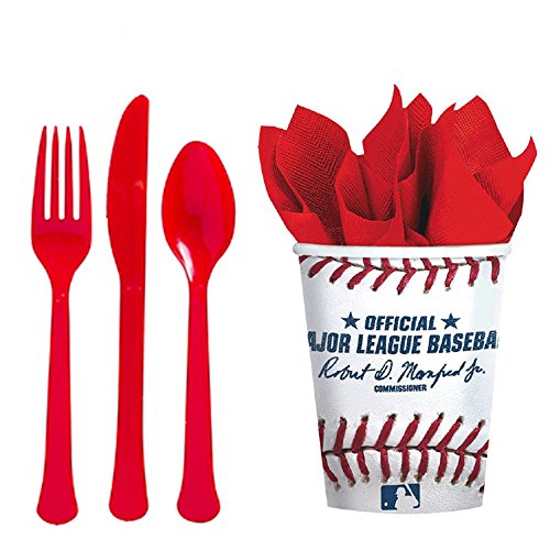 -. Feature : MLB Baseball Party Pack for 16 includes: / (16) Plates, (16) Cups, (16) Full Cutlery Sets (Fork, Knife, Spoon), (32) Napkins, (1) 54' x 102" Table cover / (16) 1.75" Baseball Poppers / Plus an EXCLUSIVE thank you card