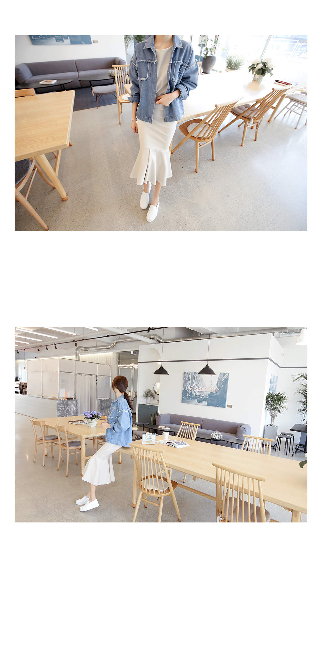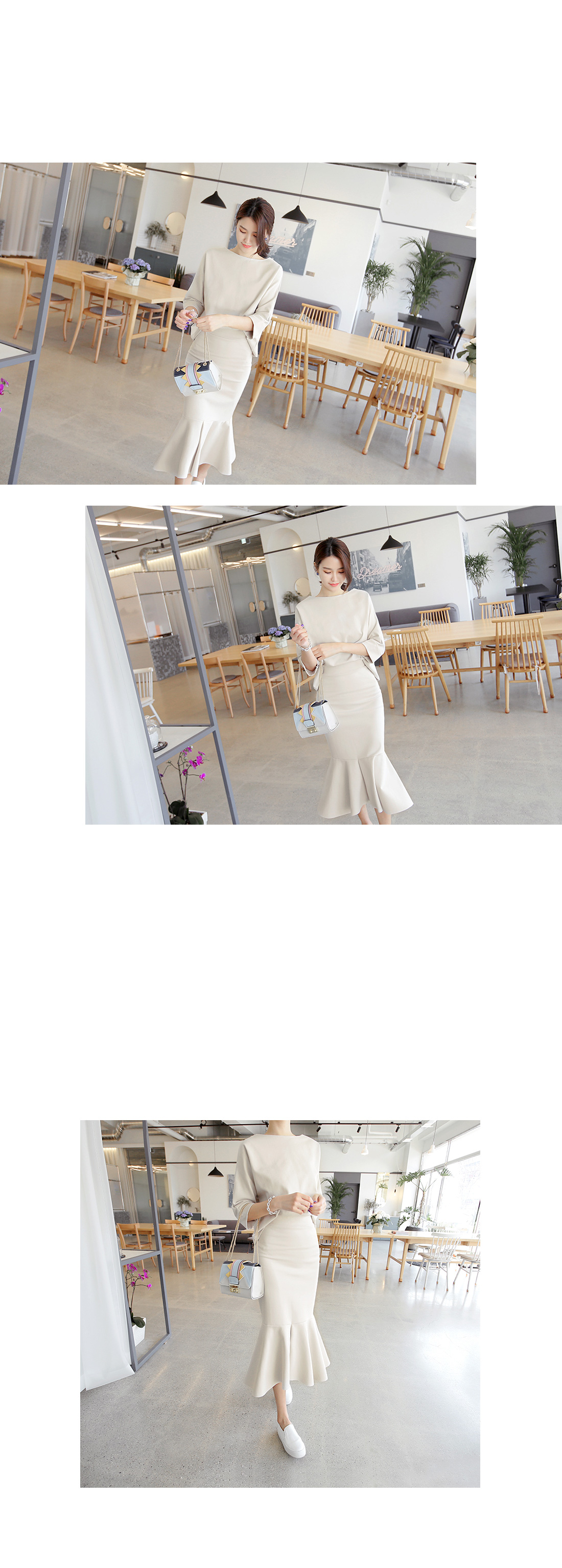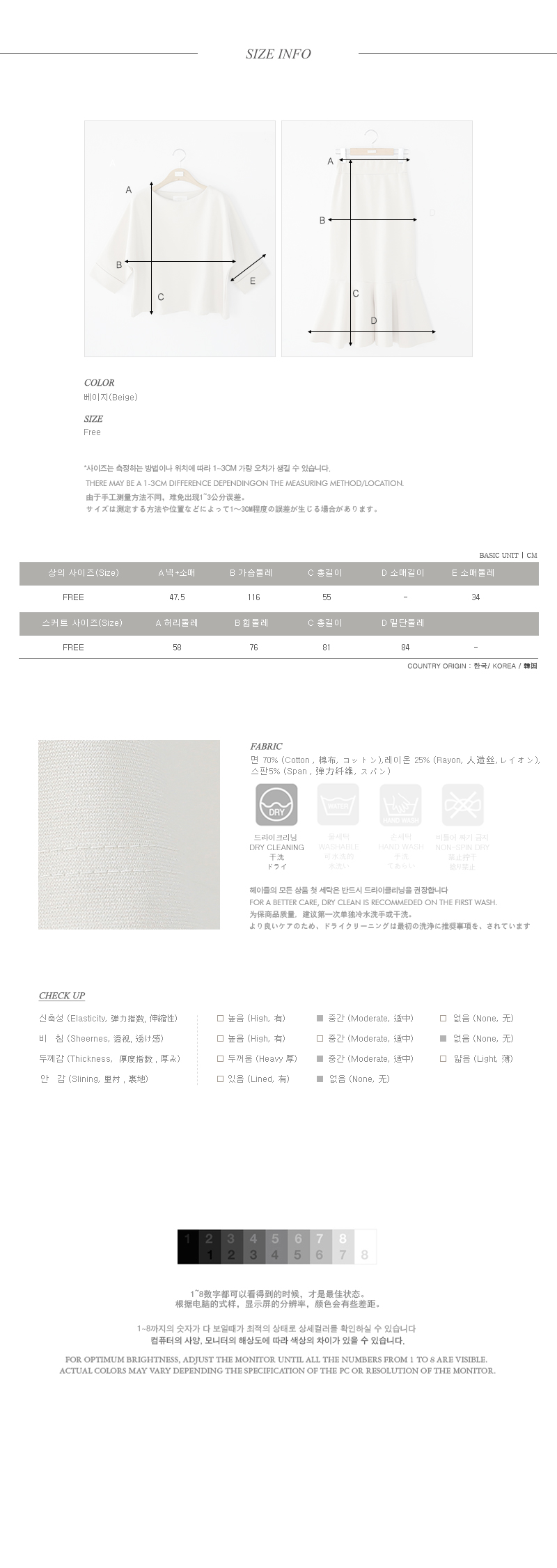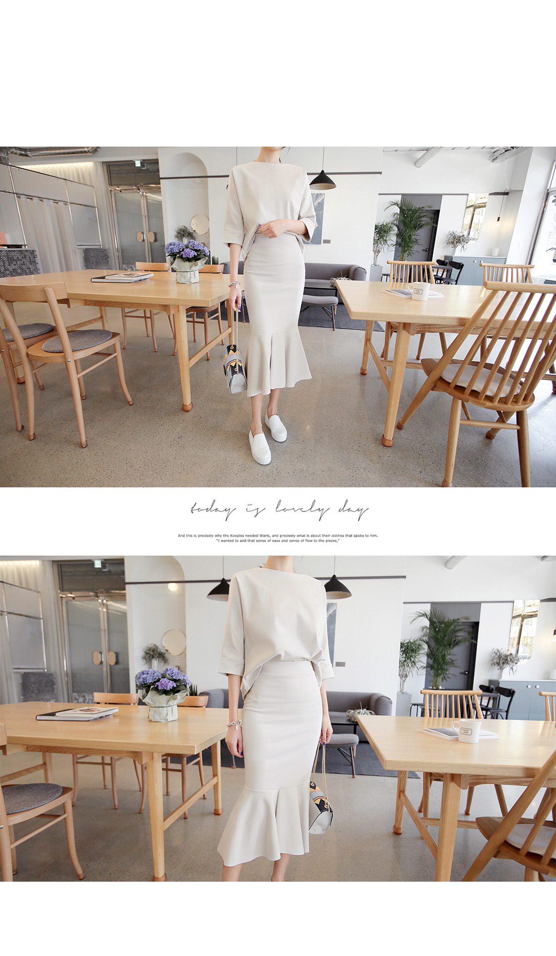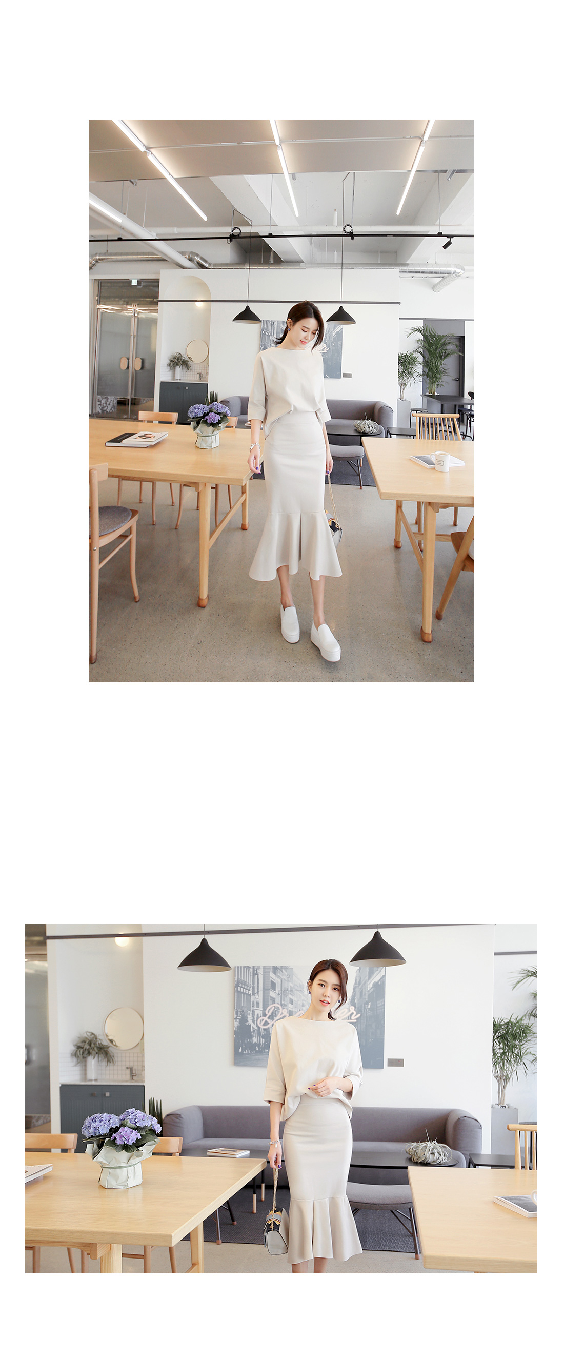 이번 시즌 유행몰이를 하고 있는 머메이드 스타일의 투피스 아이템이예요~^^ 여유있는 핏감의 상의와 프릴 디테일이 돋보이는 스커트로 스타일이 돋보이는 코디매치를 할 수 있어요~ 봄 시즌에 알맞은 포근한 컬러감과 더불어 우아한 머메이드 라인으로 힙과 골반라인을 볼륨감 있게 잡아주는 완벽하고 여성스러운 실루엣을 연출해드립니다