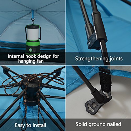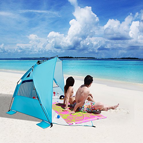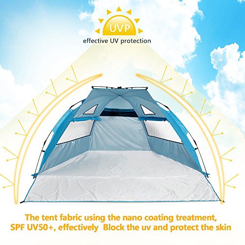 √. FUNCTIONAL DESIGN - includes 5pcs sand pockets to provide stability for windy conditions, 4 plastic stakes to anchor in the grass;4 windows for ventilation,3 storage pockets under the rear window keeping your carry items like towel, keys,1 internal hook design for hanging a fan