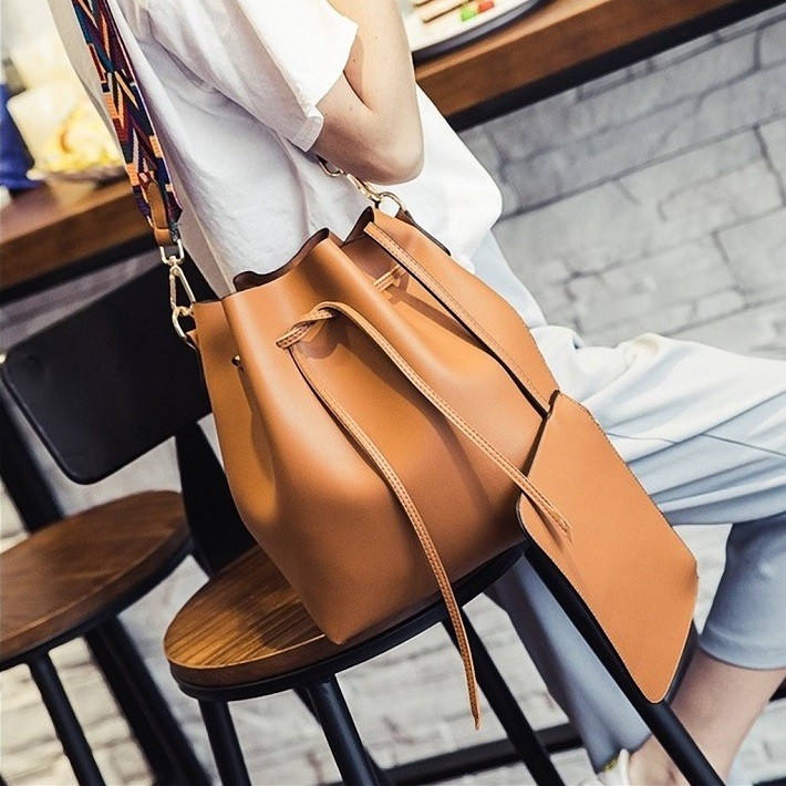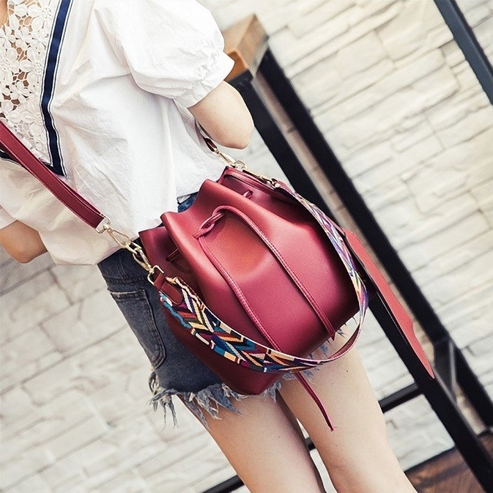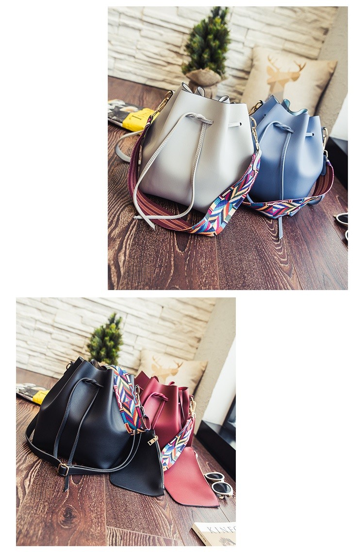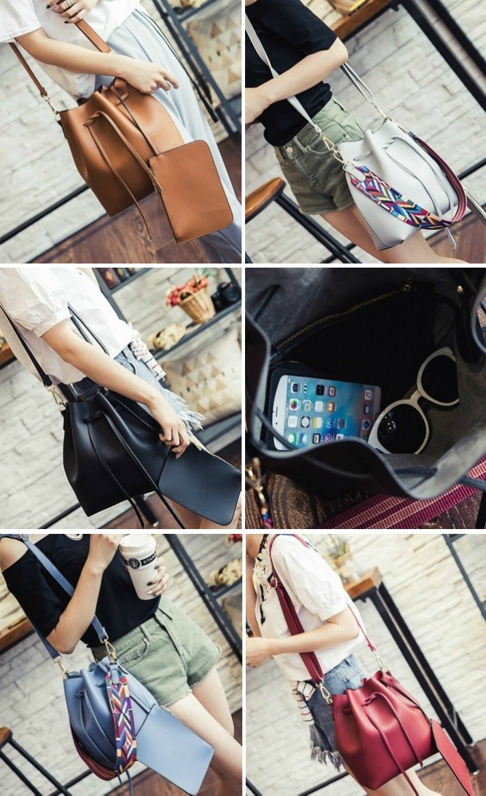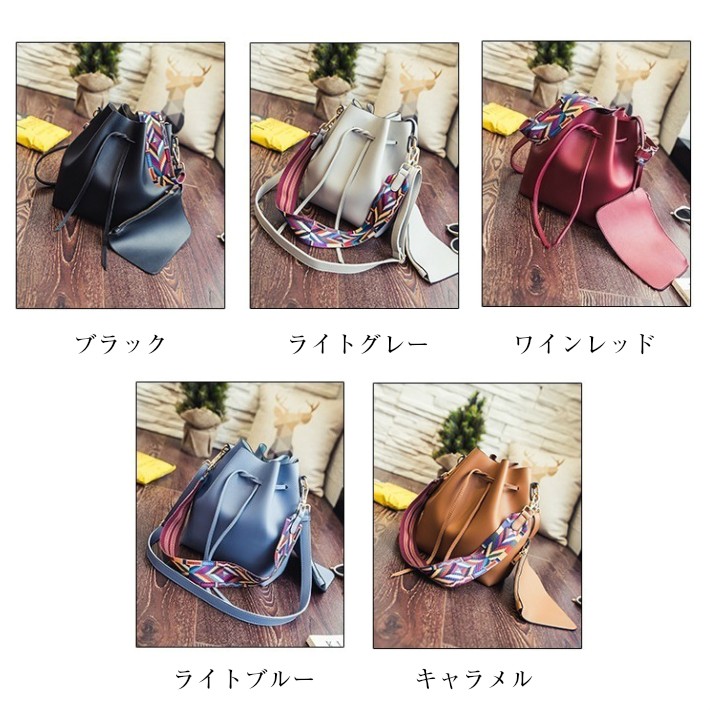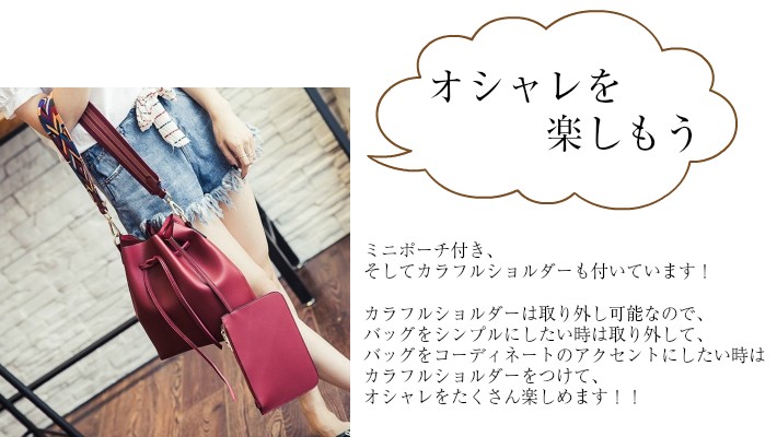 母の日、お誕生日、ホワイトデー、クリスマス、結婚記念日、入学祝い、入社祝い等のプレゼントにもおすすめです。・カラー:ブラック / グレー / ワインレッド / ライトブルー / キャラメル・素材:レザー(合成皮革)【巾着型バッグサイズ】横幅:約35.5cm高さ:約28cmマチ:約11cm重量:約500g・内ポケットなし・ブラックストラップ長さ:約62cm~約114cm(調節可能・取り外し可能)・カラフルストラップ長さ:約63cm(調節不可・取り外し可能)【ポーチサイズ】横幅:約21.5cm高さ:約14.5cmマチ:なし留め具種類:ファスナー重量:約100g・ポーチ取り外し可能※合成皮革特有のにおいがする場合がござます。においが気になる場合は、一度陰干しされてからご使用ください。※ 北海道にお住まいの方:200円  沖縄県、離島にお住まいの方:700円  別途送料を頂戴いたしますのでご了承くださいませ。