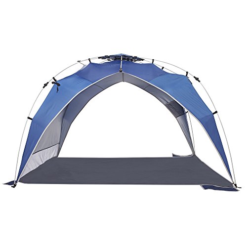 Easy up and down hub system with prethreaded poles makes this cool cabana as refreshing as a gentle pacific breeze with maximum UPF 50+ sun protection (see video)