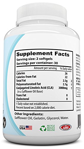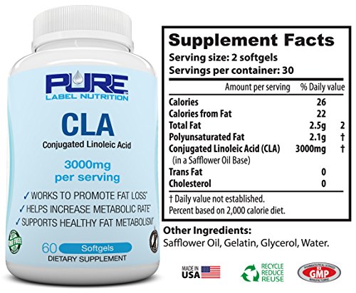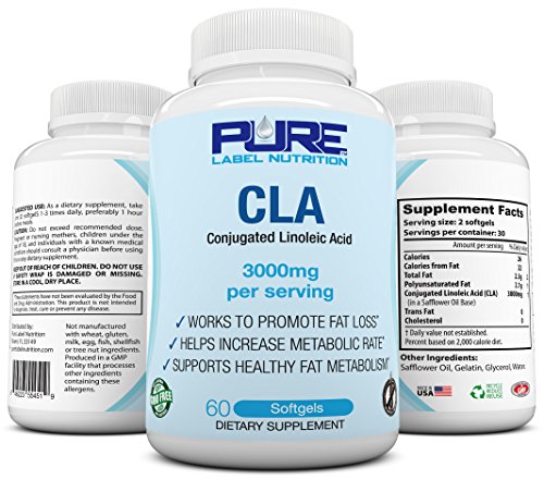 -. Binding : Health and Beauty -. Brand : Pure -. EAN : 0646223554519 -. Feature : CLA FAT LOSS FORMULA - CLA has been shown in clinical trials to aid in Fat Loss and Weight Loss by boosting the body's metabolism naturally. Pure Label's CLA Physique Enhancing Formula gets results. MONEY BACK GUARANTEE! / HIGHEST POTENCY CLA AVAILABLE - At 3000mg per serving, our CLA contains the highest dose available. Based on research, best results in Fat Loss occurs at around 3000mg per day. / CAFFEINE FREE CLA - No more jitters from weight loss supplements. Our CLA is caffeine and stimulant free making it a safe and all natural weight loss product. Burn belly fat with anxiety free energy. / ALL NATURAL CLA - Our CLA dietary supplement is plant derived from Non-GMO, gluten free safflower. Vegan and vegetarian CLA, MADE IN THE USA, formulated with zero gluten, soy or GMOs. / MONEY BACK GUARANTEE - You have nothing to lose, backed by our 100% Money Back Guarantee! If you are not 100% satisfied with your results, return for a full refund. -. IsAdultProduct : 0 -. Label : Pure Label Nutrition -. LegalDisclaimer : *These statements have not been evaluated by the Food and Drug Administration. This product is not intended to diagnose, treat, cure, or prevent any disease. Pure Label Nutrition is not liable for the authenticity of any of the information above. With the rapid rate of scientific studies these days, new information is validated and debunked daily. To maximize results, work hard in the gym daily and eat high quality nutrition. -. Manufacturer : Pure Label Nutrition -. MPN : 646223554519 -. PackageQuantity : 1 -. PartNumber : 646223554519 -. ProductGroup : Health and Beauty -. ProductTypeName : HEALTH_PERSONAL_CARE -. Publisher : Pure Label Nutrition -. Size : 60 Capsules -. Studio : Pure Label Nutrition -. Title : PURE CLA Supplement 3000mg (Highest Dose Available) Best Fat Burner + Weight Loss Supplement, All Natural Conjugated Linoleic Acid, Premium CLA Softgels Physique Enhancing Formula CLA for Men / Women -. UPC : 646223554519