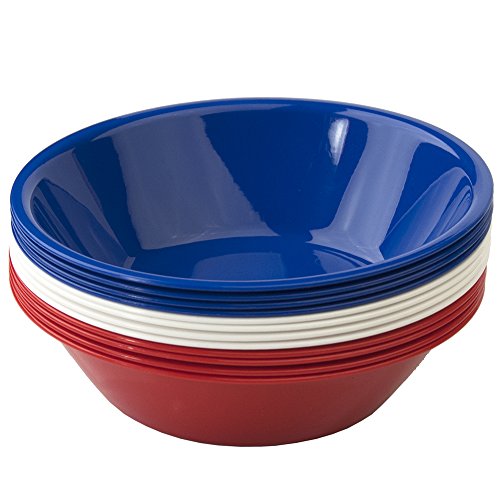 A quick and complete solution for your next outdoor party. Versatile enough to be used everyday and durable enough for use by the pool. The perfect break-resistant bowl set for the new college student or first apartment. These bowls are a fun addition to any new kitchen. A step up from disposable dinnerware, they are also great for the patio or picnic. Set of twelve 7-1/2" bowls in 3 assorted colors. Top rack dishwasher safe. Made in USA.