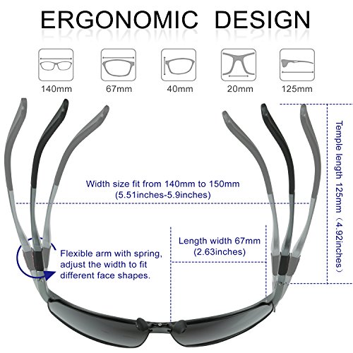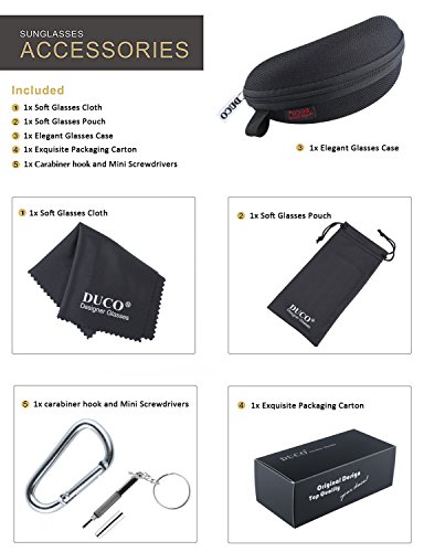 -. Feature : 【TAC POLARIZED LENS 】UV400 Protection Coating blocks 100% of harmful UVA & UVB rays. Visually restores true color, eliminates reflected or scattered light. TAC polarized triacetate lenses are impact and scratch resistant, lightweight and durable! / 【AL-MG METAL ALLOY FRAME】 Lightweight AL-MG alloy design is ideal for cycling, driving, running, fishing, racing, skiing, climbing, and all outdoor activities enthusiasts. At only 25g, you can hardly feel them on your face. / 【PRODUCT DIMENSIONS】Overall Width: 140mm/5.51inches; Lens Width: 67mm/2.64inches; Lens Height: 40mm/1.57inches; Temple Length: 125mm/4.92inces; Bridge Width: 20mm/0.78inches / 【30 DAY MONEY BACK GUARANTEE】 All DUCO customers enjoy our 30 Day Money Back Guarantee. Return for a full refund if not satisfied for any reason. There's no risk to try and we provide a superior customer service experience. / 【LIFETIME BREAKAGE WARRANTY】 Even if you somehow manage to break these glasses, simply contact DUCO glasses. DUCO provides lifetime after sale service for all DUCO products. Just contact seller by clicking below on our name and then click the 'ask a question' button.