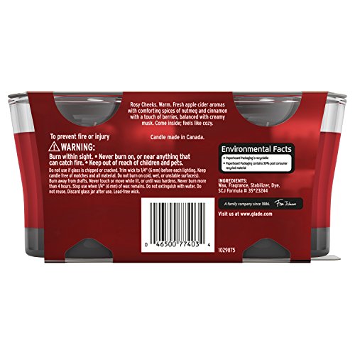ReleaseDate : 2017-10-02 Studio : SC JOHNSON Publisher : SC JOHNSON Binding : Health and Beauty Product Description Enhance the atmosphere of any room with the comforting glow of candlelight. Glade Jar Candles quickly fill your home with a combination of alluring fragrance and warm light. Rosy Cheeks. Warmth. Delightful apple notes with comforting spices of nutmeg and cinnamon. A touch of berries notes, balanced with creamy musk. Come inside; feels like cozy. 0