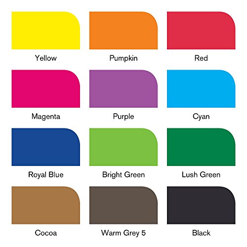 Contains yellow, pumpkin, red, rouge, magenta, Purple, cyan, royal blue, bright green, lush green, Cocoa, warm grey 5 and Black