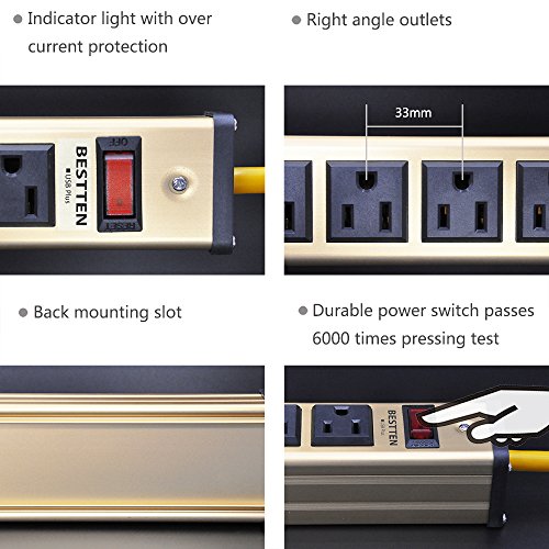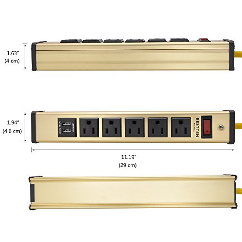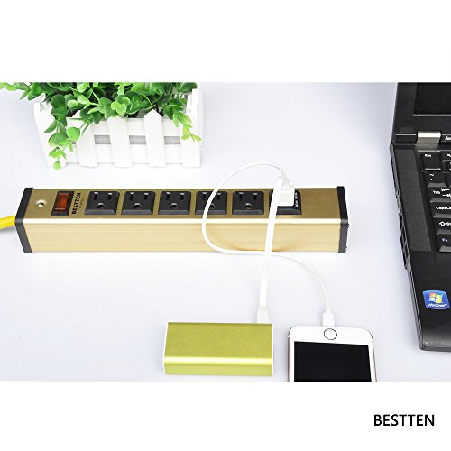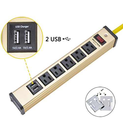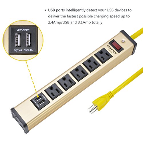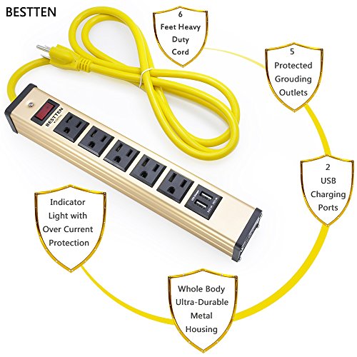 Bestten Heavy Duty Metal Power Strip with 2 USB Charging Ports (3.1A) and 5 Outlets, 6-Foot Cord