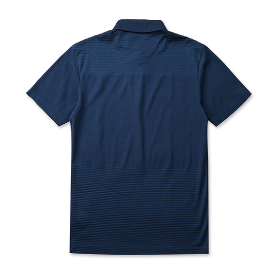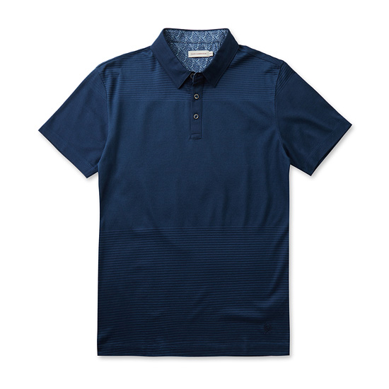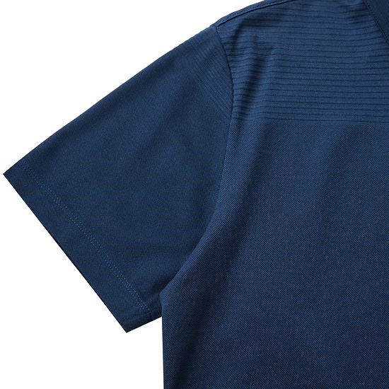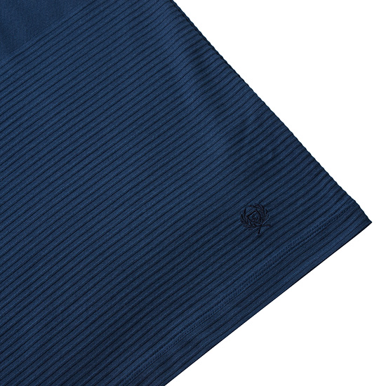 - 베이직한 컬러에 스트라이프 조직감을 적용한 남성 반팔 카라 티셔츠.