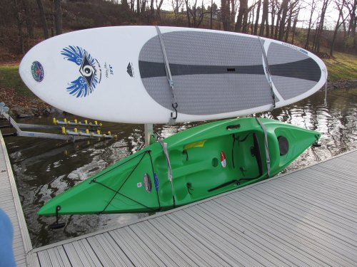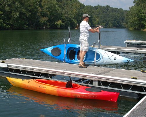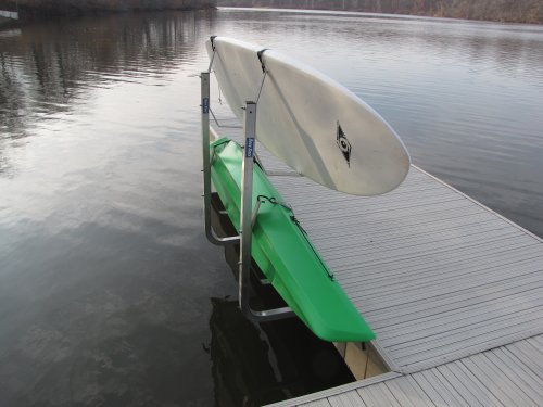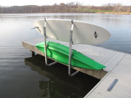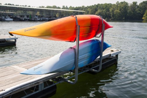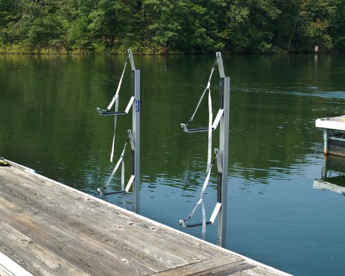 The Dock Sides Vertical Kayak Rack makes mounting a pair of kayaks on your dock a snap. And you get a cost effective and sturdy mount without sacrificing any dock surface area. The Vertical Kayak Rack consists of four J-hook style brackets which are mounted on two tube uprights. You simply rest your kayak on its side in the J-hooks and secure it with straps which are easily secured and released.Feature