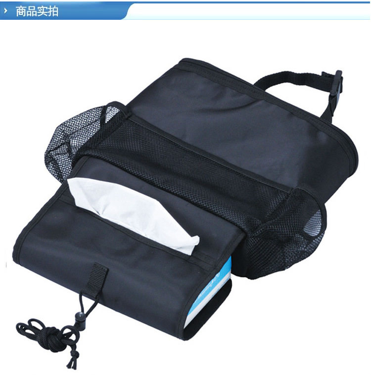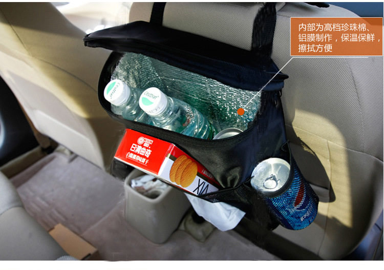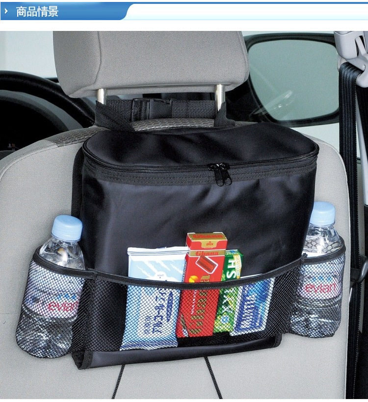 【产品特点】1、本品最大的特点是容量超大,固定在椅背后面,可以存放杂志、CD以及纸巾盒等。2、两侧的饮料袋,采用了特殊的保温材料,相当于冷热型小冰包。3、做工精致,设计合理,方便耐磨,功能齐全。