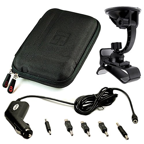 -. Feature : Stylish yet durable VanGoddy GPS carrying case with removable metal carbineer / Durable semi hard exterior complimented with a silk like microfiber lined interior / Mesh pocket can accommodate memory cards, cables or charger alongside your GPS / Dual Velcro restraint straps hold your GPS in place and prevent it from falling out / Includes 5 in 1 GPS Car Charger + Windshield Mount