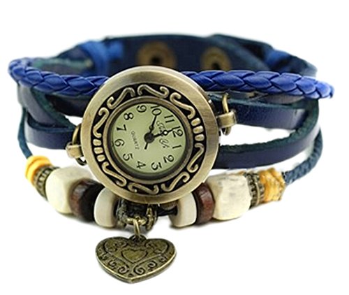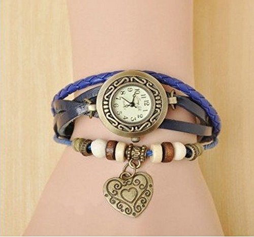 -. Title : Boho Chic Vintage Inspired Bracelet Leather Rope Watch With Heart (Blue)