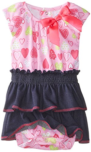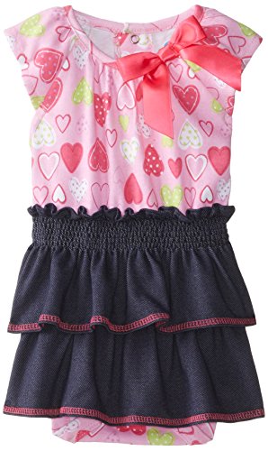 Short-sleeve bodysuit in allover heart patterning and tiered skirt with smocked waistband