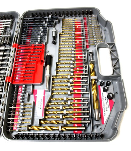 - Feature : Titanium, Black Oxide Steel, Brad Point and Masonry Drill Bits / Titanium Drill Bits size: 1/16" up to 1/2" / Complete Lock Installation Kit with Hole Saw, Mandrel and Spade Bits / Features additional storage to keep fasteners and extra parts / Includes 1", 2" Drive Bits as well as Nut Setters