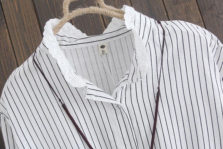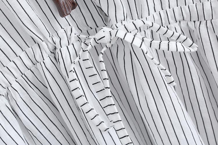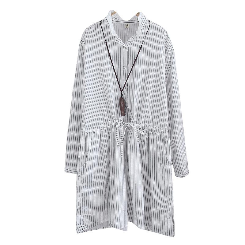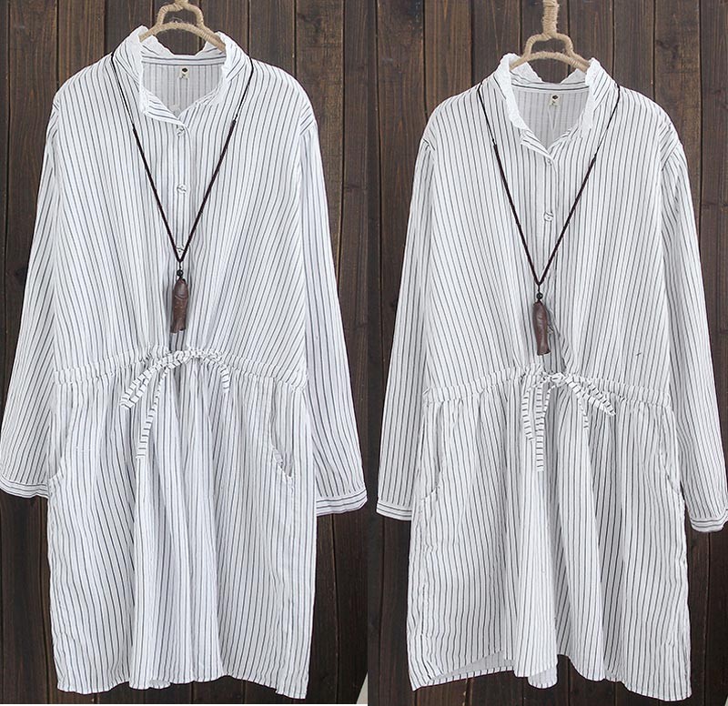 レース付きスタンドカラーのペンシルストライプ柄長袖ワンピース♪