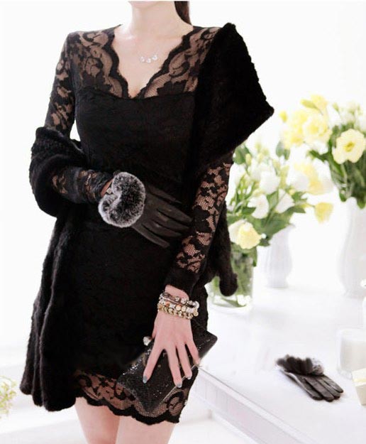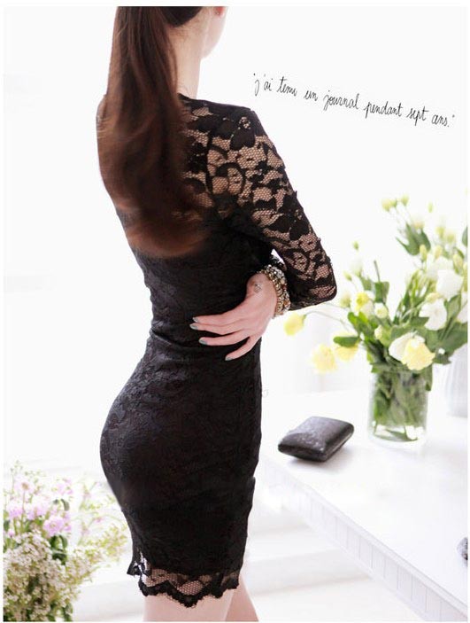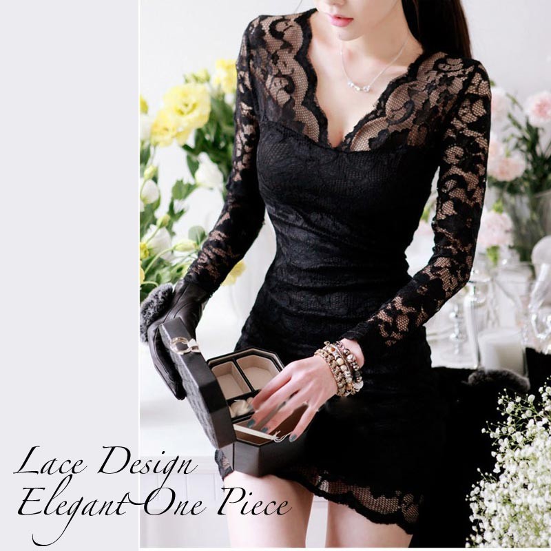 深いVネックラインの総レース・ショート丈・タイトシルエットワンピース♪