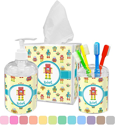 -. Brand : RNK Shops -. Color : Yellow -. Feature : YOU WILL RECEIVE AN EMAIL WITH A LINK TO CUSTOMIZE YOUR ORDER WITHIN 1 BUSINESS DAY / Custom P.R.Inted with Your Design / 3 piece set / Inserts P.R.Inted on premium gloss media / Vibrant, colorful design -. Label : Mom Innovations -. Manufacturer : Mom Innovations -. MPN : mi-bath-acc-bundle+Robot -. PartNumber : mi-bath-acc-bundle+Robot -. ProductGroup : Home -. ProductTypeName : HOME_BED_AND_BATH -. Publisher : Mom Innovations -. Studio : Mom Innovations -. Title : Robot Bathroom Accessories Set (Personalized)