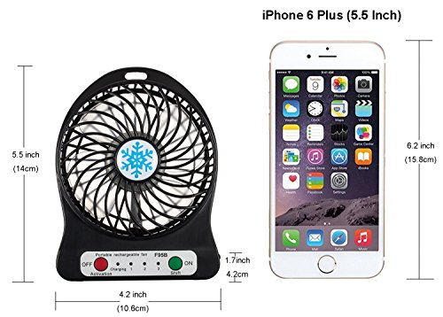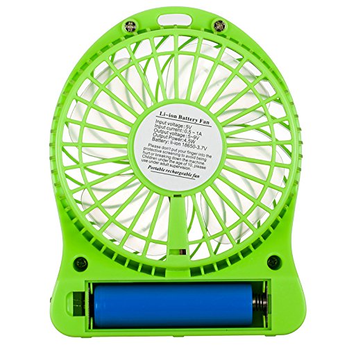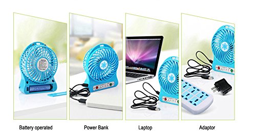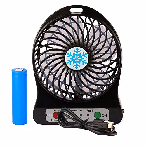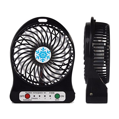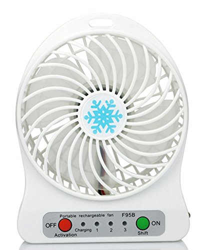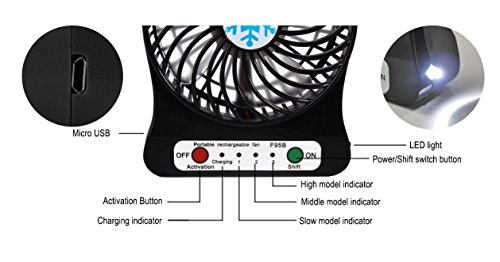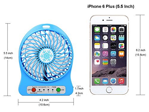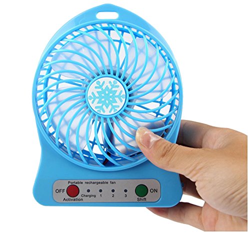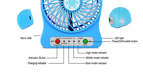 -. Feature : Portable: Small and compact size, easily into a bag. Perfect personal mini cooling fan for indoor - the office, home, kitchen, bedroom, dorm, study, library or outdoor activities - picnic, sporting events, camping, hiking, cycling, backpacking, climbing, travel and more / Three speeds to meet your need. The "ON" button: Click the button, the fan will cycle in turn, press once to change a speed, the sequence is " 1 speed - 2 speed - 3 speed -LED light on- power off ". / Long press (about 5 seconds) the "ON" button when fan is working at any speed, the gorgeous blue light will emit. The unique design of blue decorative light! / Powered by rechargeable 18650 lithium battery (included)and USB with Micro USB cable (included) / Super Quiet: Strong wind produced by brushless motor. Ultra-quiet design, 20% quieter than other brush motor USB fans