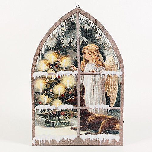 -. Feature : The canvas P.R.Int is shaped like a cathedral window and features an angel decorating a Christmas tree / Angel canvas P.R.Int with 8 led lights / Requires 2 aa batteries (not included) / Easy to hang with notch at the top / Product weight: 0.7 lb.
