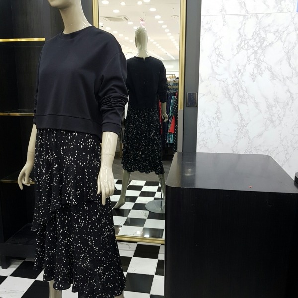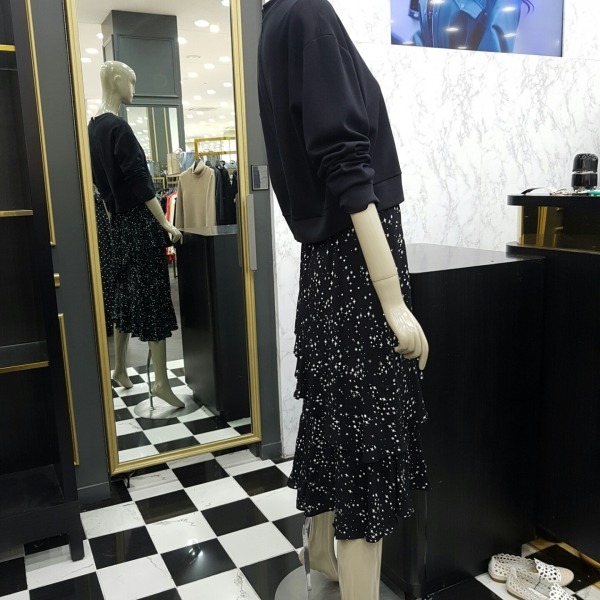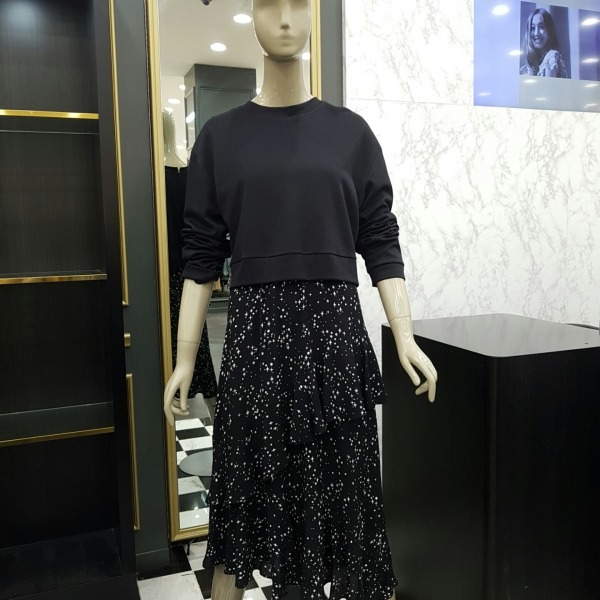 진한 블랙바탕에 눈꽃무늬가 프린팅된 캉캉 쉬폰 원피스위에 덧입은듯한 스?셔츠가 세트인 원피스입니다일체형이라 따로 분리는 안되지만 오히려 겉옷 따로 신경안쓰고 입으시다 바로 아우터와 함께 입어주시기 좋은 상품입니다?