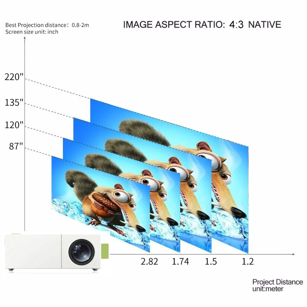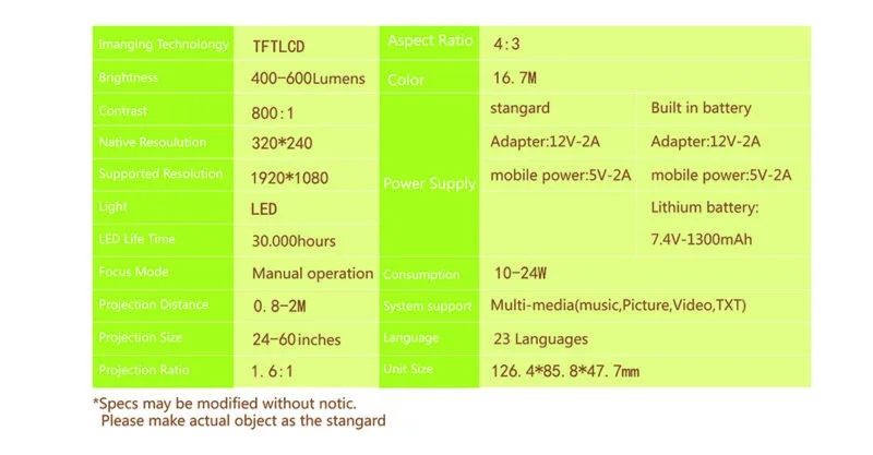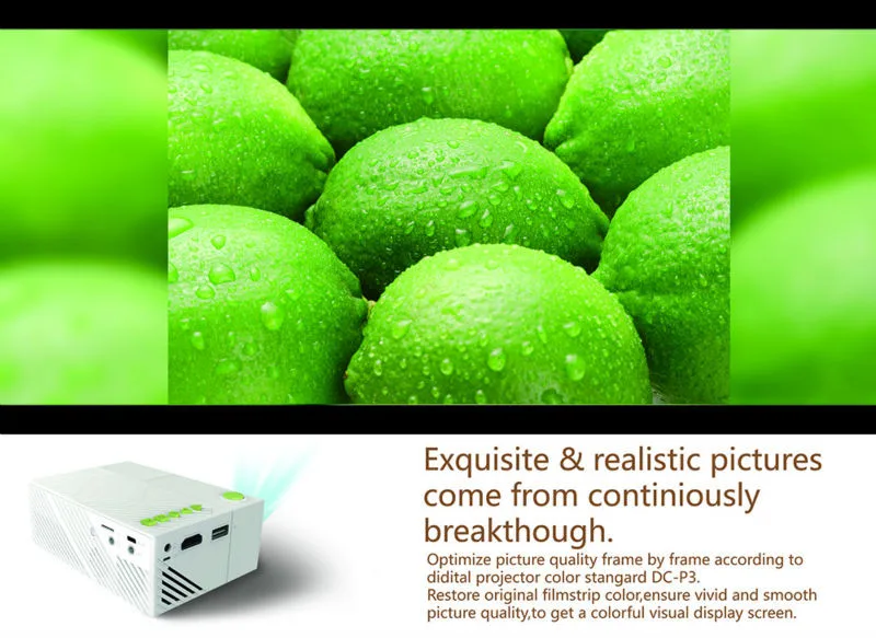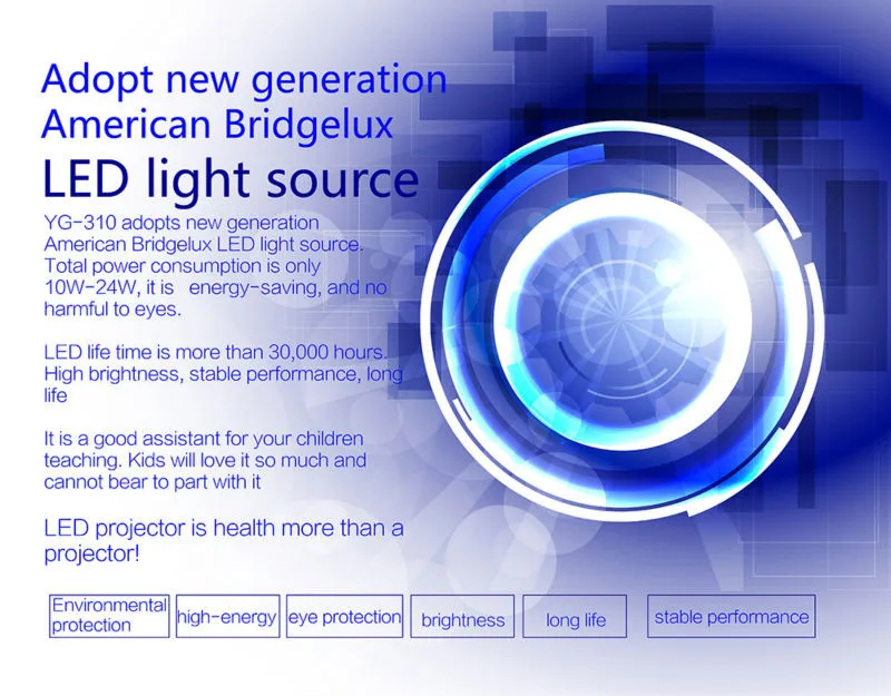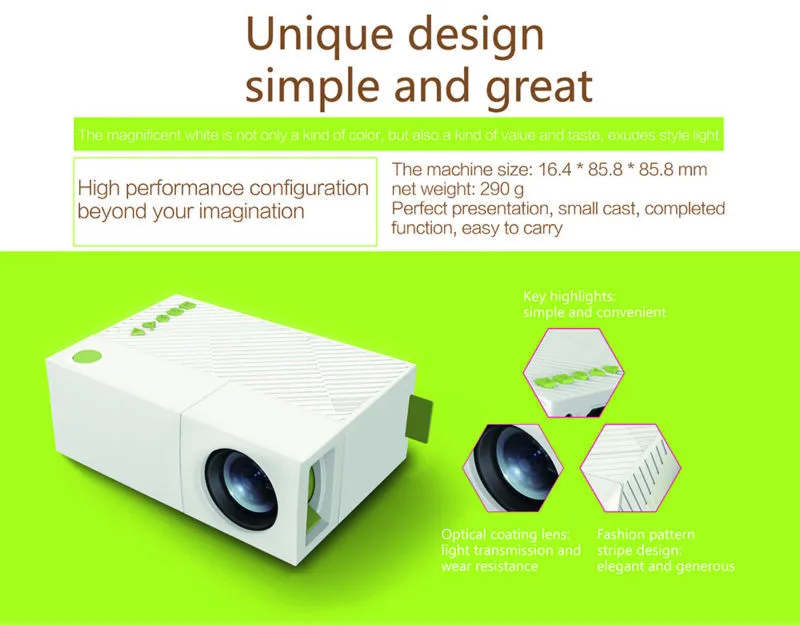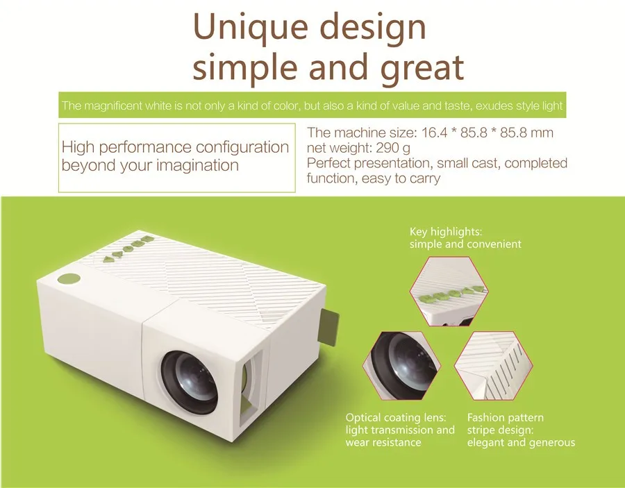 YG-300 LCD Projector is a multimedia player with 320 x 240 pixels, visible 400 - 600 lumens and 800:1 contrast ratio. With this small but high performance projector, you can enjoy the high-quality images and videos in a very comfortable position.